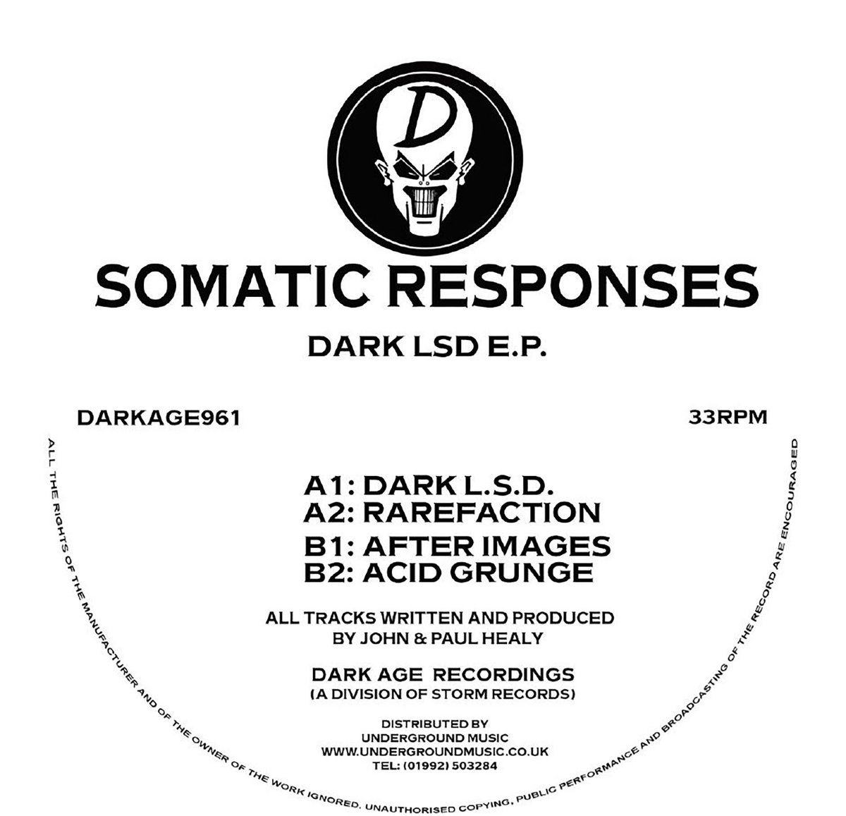 Originally scheduled for release back in the nineties. This EP differs from the Shadowcast Recordings release bearing the same title. It contains 2 tracks that were only ever on the Darkage white labels. Only a handful of white labels were ever made of this release back in 1996. It has been remastered from the original DAT which was unearthed in a pile of tapes from Mo's Music. Mastering from Shane The Cutter. I am so impressed how incredible these tracks sound 20 years on. 4 stunning tracks from the Healy brothers.